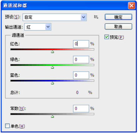 如图所示,将源通道“红色”设置为“0”,RGB模式的图像将呈现什么效果?()