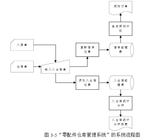 图3-5所示是某“零配件仓库管理系统”的系统流程图。从图中可以看出该系统的以下特点: (1)系统将以入库单、出库单为依据进行入出库操作,并通过更新库存程序对库存记录文件进行更新,通过入出库记录程序将入库、出库记录添加到入出库数据表中。 (2)系统将以库存数据表中记录的库存量为依据确定采购计划,当某零配件的库存量低于规定的下阈值时,该零配件将会进入到订购单中。其中,订购单由生成采购计划程序产生。 (3)系统将以入出库数据表中的记录为依据进行入出库统计分析,产生入出库统计分析报表。 试根据对图3-5中的系统流程图的理解,将“零配件仓库管理系统”从其工作环境中分离出来,并建立该系统的“系统框架图”。