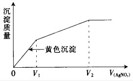 的稀溶液中滴入AgNO溶液,沉淀的质量与加入AgNO溶液体积的关系如右图所示。则原溶液中c(I[
