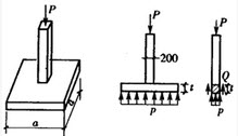 正方形截面的混凝土柱,其横截面边长为200mm,基底边长为a=0.8m的正方形混凝土板。柱受轴向压力P=100kN,如图所示。假设地基对混凝土板的支反力为均匀分布,混凝土的许用剪应力为[τ]=1.5MPa,试问混凝土板满足剪切强度所需的最小厚度t应为()。
