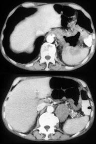B:左侧恶性嗜铬细胞瘤侵及胃脾