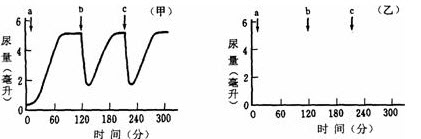 如图是狗尿液浓缩实验的结果。让狗大量饮水(图中箭头a所示)后,连续排出大量的尿;当将2.5%NaCl溶液10mL注射人颈动脉(箭头b)后,尿量暂时减少;当静脉注射垂体后叶提取物(箭头c)后,尿量也减少。根据此实验,可以推断: