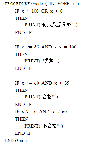 试分别使用语句覆盖、条件覆盖设计学生等级成绩输出程序的测试用例。 该程序伪码如下: