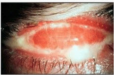 患者,男,23岁,右眼角膜异物剔除术后红痛视力下降加重1天。体格检查VOD0.08,右眼眼睑痉挛、红肿,结膜混合充血、水肿,角膜明显水肿,灰白色混浊,表面可见大量黏液状分泌物,颞侧大片上皮脱失,前房下方可见3mm白色积脓,眼内不清。
