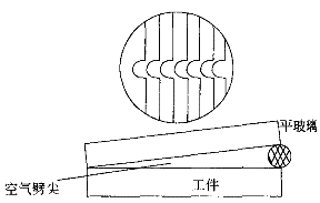 用劈尖干涉法可检测工件表面缺陷,当波长为λ的单色平行光垂直入射时,若观察到的干涉条纹如图所示,每一条纹弯曲部分的顶点恰好与其左边条纹的直线部分的连线相切,则工件表面与条纹弯曲处对应的部分应:()