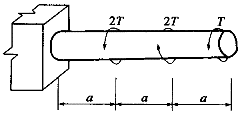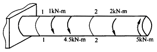 如图所示,左端固定的直杆受扭转力偶作用,在截面1-1和2-2处的扭矩为:()