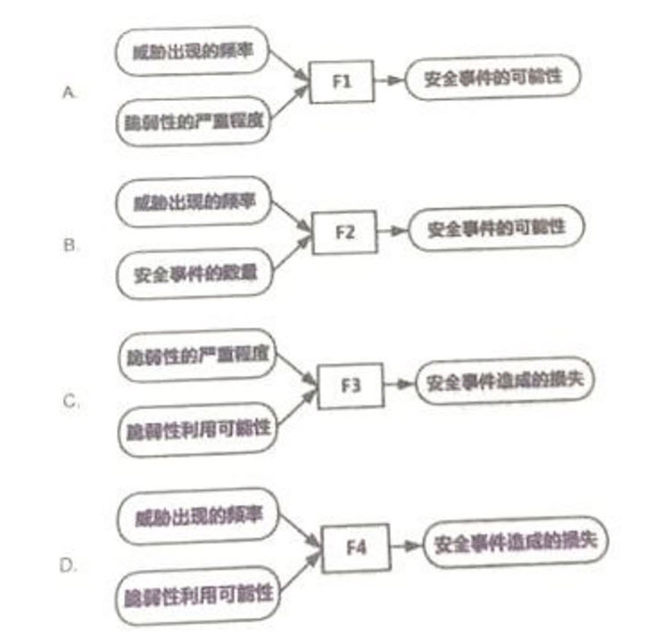 小陈自学了信息安全风险评估的相关理论知识后,根据风险分析阶段的工作内容和计量方法只是,绘制了如下四张图,图中F1、F2、F3、F4分别代表某种计算函数,四组图中,计算关系表达正确的是()。