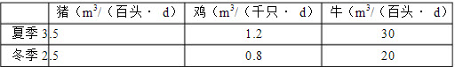 某集约化养殖场饲养生猪12000头,肉鸡30万只,奶牛3500头。采用水冲洗工艺清理畜禽粪便,排水定额如下表