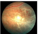 B:眼底检查黄斑部视网膜下一类圆形灰白色病灶,周围有出血