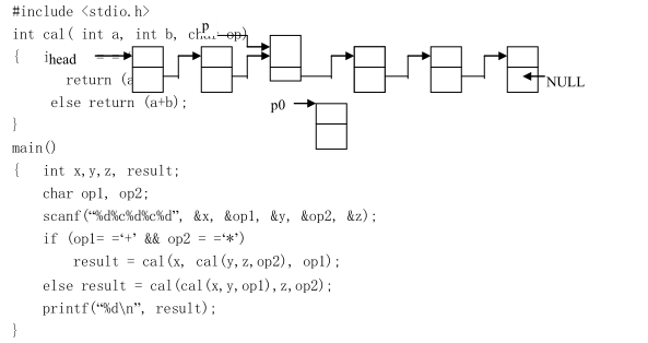 请填空。(1)当输入为3+4*5时,下述程序将输出() (2)当把下述if语句op1==‘+’&&op2==‘*’中的op1,op2对调后,对于输入为3+4*5时,下述程序将输出:()