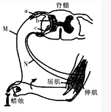 人手指意外触到蜡烛火焰,引起屈肘反射。其反射弧示意图如下: