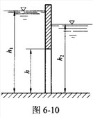 如图6-10所示,水库上下游水深h1=6m、h2=5m,闸板高h=3m,宽1m。则闸板上的水压力为()kN。