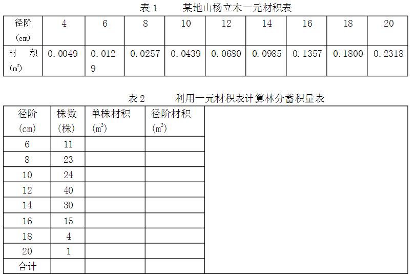 ,标准地调查每木检尺结果如表2中所示,将本*地区山杨一元材积表示于表1,请采用材积表法测算该山杨林分蓄积量。