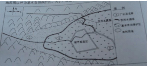 某有色金属冶炼项目初步选址A、B、C、D四个方案,如图所示,当地主导风向为西风、次主导风向为东风,同时受局域地形影响,静风出现频率较高,城市规划用地范围以外为基本农田保护区。关于厂址论证哪一项是错误的()