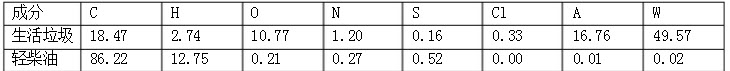 某垃圾焚烧处理生活垃圾量为300t/d,需要添加辅助燃料轻柴油1.2t/d,生活垃圾和轻柴油质量分析成分如下表所示:生活垃圾和轻柴油质量分析成分表(%)
