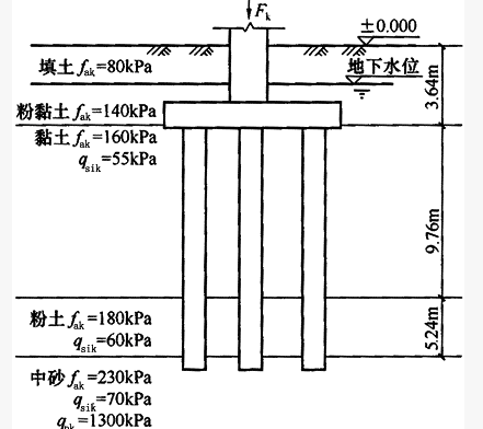 某建筑柱下桩基承台,采用6根沉管灌注桩,桩身直径d=426mm,桩端进入持力层的深度为2500mm。桩基承台顶面处作用有竖向力F、力矩M和水平剪力V,承台及承台土的平均重度YG=20kN/m3。承台平面尺寸和桩位布置、桩基础剖面和地基土层分布情况见图6.1.6所示。按《建筑地基基础设计规范》作答。
