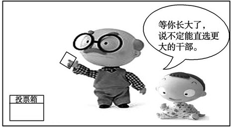 下边漫画:在村委会选举中“等你长大了,说不定能直选更大的干部”反映了①直接选举优于间接选举②社会主义民主政治的发展是一个逐步完善的过程③选举方式的选择要顺应社会进步与经济发展的要求④村民直选村委会成员是村民参与国家事务管理的表现()