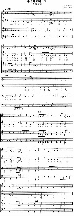 分析歌曲《半个月亮爬上来》谱例,写出: (1)调式调性。 (2)曲式结构。 (3)旋律特点。