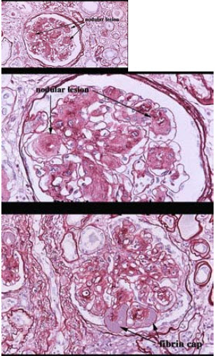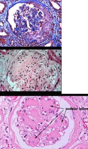 患者,女性,32岁,1型糖尿病15年,1年来间断眼睑及双下肢浮肿,血压160/90mmHg,尿蛋白(+),肾脏活检如图所示,尿糖(++)