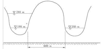 如图所示,某水库的一段库岸存在邻谷渗漏,渗漏带宽1200m。两谷间的距离为600m,两谷间岩土体的渗透系数为8×10