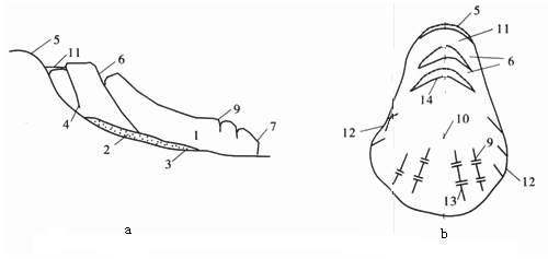 B:2-滑坡壁,5-滑动带,6-滑坡台阶,11-封闭洼地