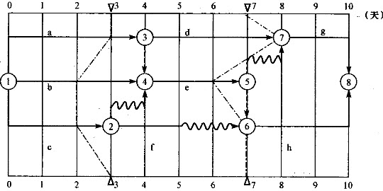 某分部设备工程的时标网络计划如下图所示,当计划执行到第3天和第7天结束时检查进度执行情况,检查结果表明()。