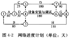 【背景材料】某工程项目,业主通过招标与甲建筑公司签订了土建工程施工合同,包括A,B,C,D,E,F,G,H等8项工作,合同工期360天。业主与乙安装公司签订了设备安装施工合同,包括设备安装与调试工作,合同工期180天。通过相互协调,编制了如图4-2所示的网络进度计划。
